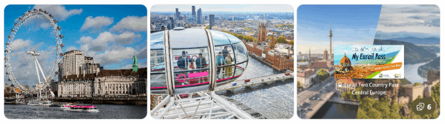 *유럽 주요 도시(런던, 파리 등)에서 테마파크, 시티투어, 기차패스(예: Eurail) 등을 예약할 수 있어요.