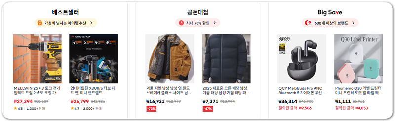 *베스트셀러 쪽은 “가성비 전자기기 / 라이프스타일” 쪽 제품이 인기